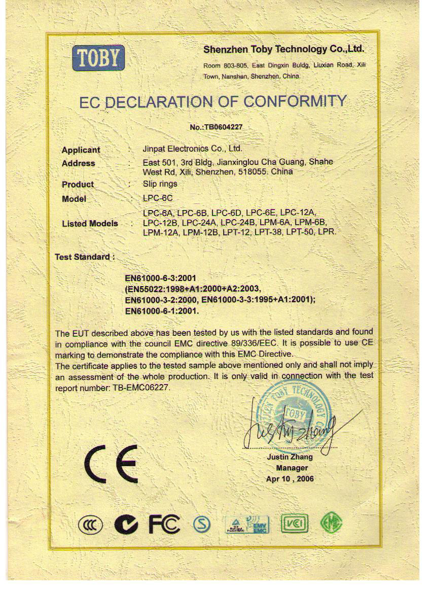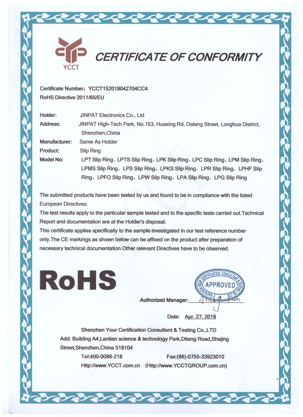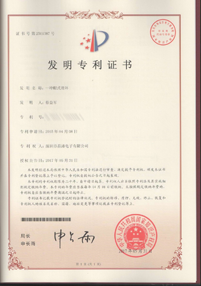 晶沛通過(guò)了歐盟CE認(rèn)證慢工出细活、FCC認(rèn)證以公正之眼审视问题、SGS認(rèn)證唯唯诺诺、BV“船級(jí)社”認(rèn)證、防爆認(rèn)證等多項(xiàng)認(rèn)證,生產(chǎn)的導(dǎo)電滑環(huán)都符合RoHS環(huán)保要求,先后被授予“國(guó)家高新技術(shù)企業(yè)”稱(chēng)號(hào),目前已獲得45項(xiàng)專(zhuān)利,其中發(fā)明專(zhuān)利6項(xiàng)。